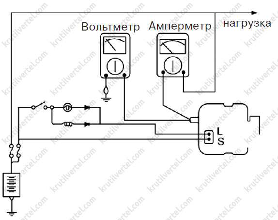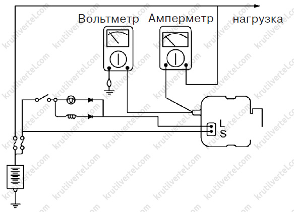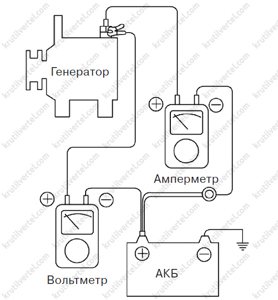 1. Перевірити, щоб вольтметр показував також значення, як і напруга акумуляторної батареї. Якщо вольтметр показує 0В, значить, є розрив ланцюга у проводах між клемою «В» генератора та негативною клемою акумуляторної батареї або погане з'єднання з масою.