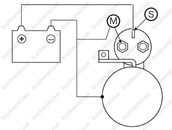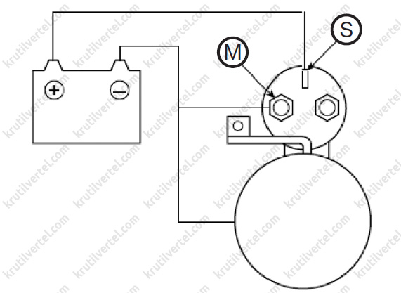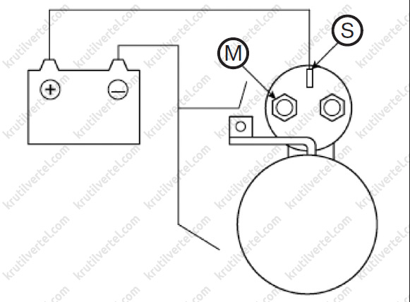 2. Підключити позитивну клему акумуляторної батареї до клеми «S» та негативну клему до клеми «М» та до корпусу стартера.