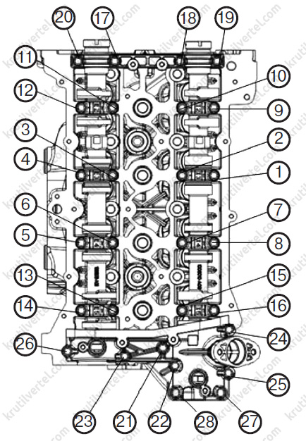 - Затягнути болти кріплення кришок підшипників розподільних валів впускних та випускних клапанів у послідовності, вказаній на малюнку.