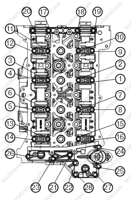 - Викрутити болти кріплення кришок підшипників розподільчих валів впускних та випускних клапанів у зворотному порядку, вказаному на малюнку.