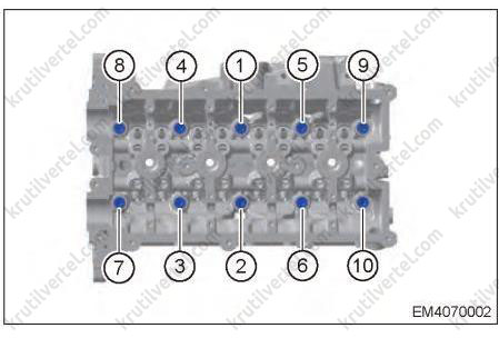 - Викрутити 10 болтів кріплення головки блоку циліндрів у порядку, вказаному на малюнку нижче.