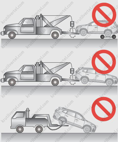 - Буксирування евакуатором з тросовим підйомником за задню частину автомобіля під час опори передніх коліс на дорогу.