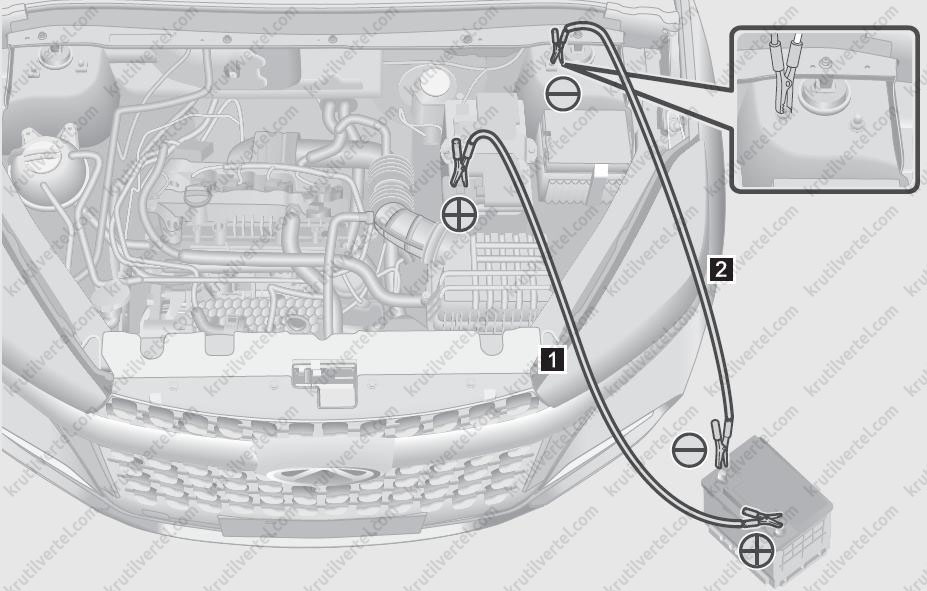 - Напруга зовнішньої акумуляторної батареї повинна становити 12 В. Не приступайте до пуску двигуна від зовнішньої акумуляторної батареї, поки не переконайтеся, що її напруга відповідає нормі.