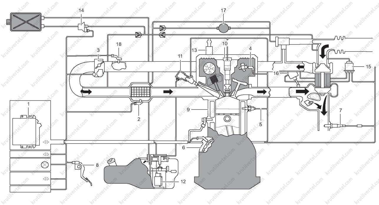Система керування двигуном в основному складається з модуля керування двигуном (ECM), датчиків і виконавчих механізмів, які контролюють кількість повітря, що всмоктується, об'єм упорскування і час запалювання і т. д. коли двигун працює.
