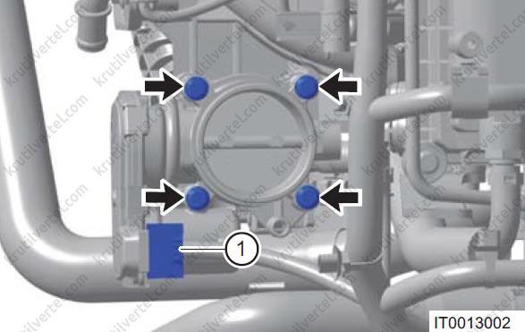 - Від'єднайте роз'єм дросельної заслінки з електроприводом (1), відкрутіть чотири кріпильні болти (стрілки) та зніміть дросельну заслінку.