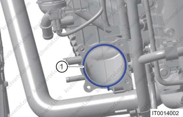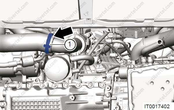 - Послабте черв'ячний хомут (стрілка) та від'єднайте випускний патрубок інтеркулера I від випускного патрубка інтеркулера II, зніміть випускний патрубок інтеркулера II у зборі (1).