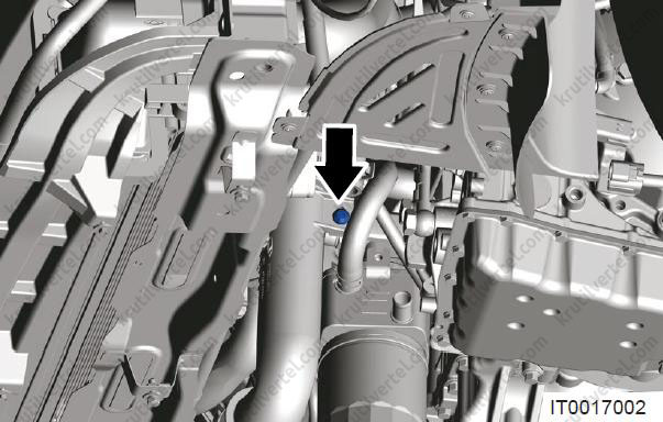 - Викрутіть кріпильний болт (стрілка) з випускного патрубка інтеркулера II.