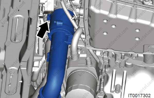 - Послабте черв'ячний хомут (стрілка) та від'єднайте дросельну заслінку від випускного патрубка інтеркулера II.