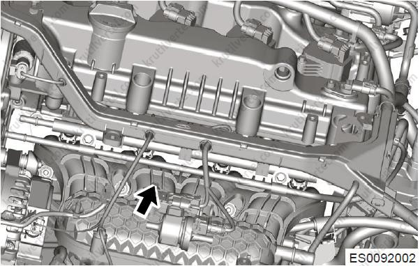 - Якщо необхідно зняти паливну рампу, від'єднайте роз'єм джгутів проводів паливних форсунок, відверніть гвинти кріплення паливної рампи, від'єднайте джгут проводів від кріплень. Потім, взявшись обома руками за форсунки, акуратно зніміть рампу зі впускного колектора. При цьому на головці блоку циліндрів не повинно залишатися кільце ущільнювача.