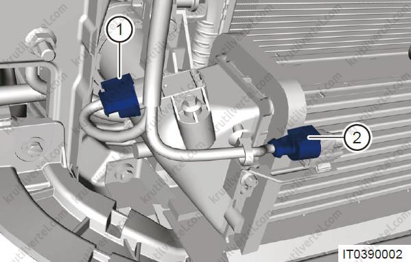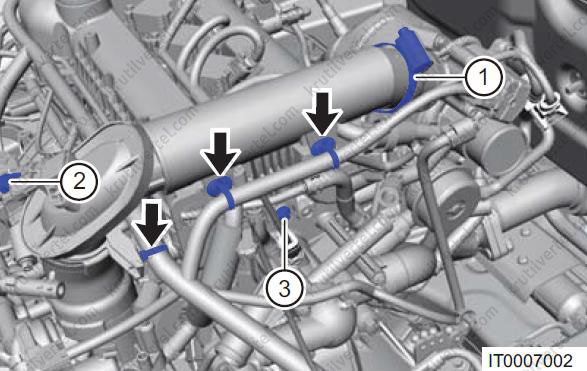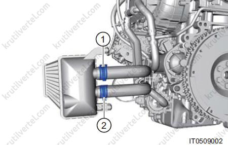 - Послабте хомут (2) і від'єднайте комплект трубок, що підводять, охолоджуючої рідини від інтеркулера.