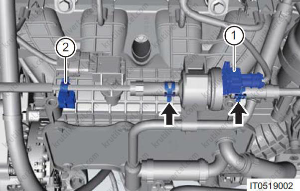 - Від'єднайте роз'єм (1) електромагнітного клапана адсорбера.