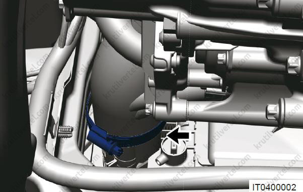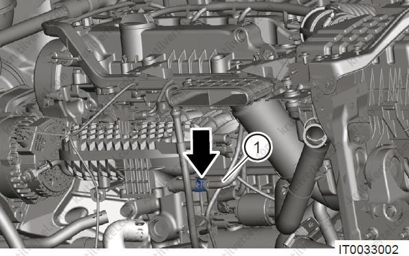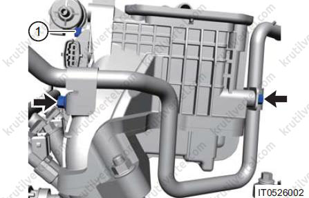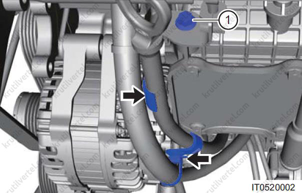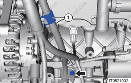 - Послабте хомут (1) і від'єднайте комплект трубок для охолодження рідини.