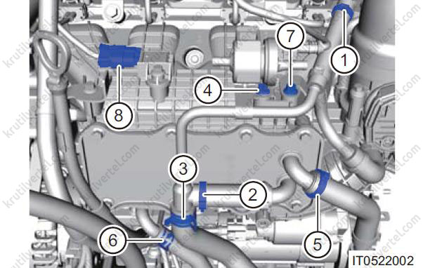 - Послабте хомут (5) і від'єднайте комплект трубок, що підводять, охолоджуючої рідини від інтеркулера.