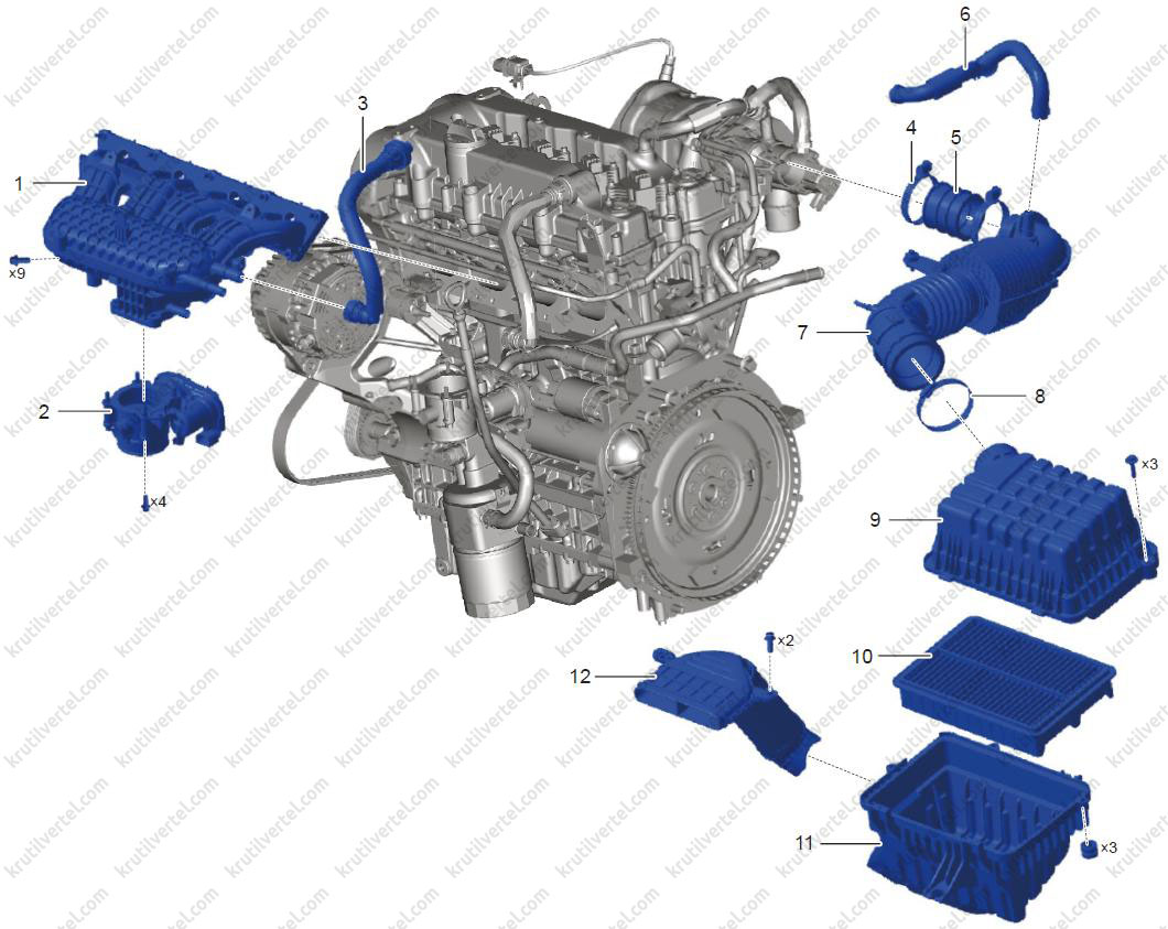 Основними компонентами системи впуску повітря є напрямний патрубок повітря в зборі, повітряний фільтр, впускний шланг, турбонагнітач, датчик температури та тиску наддувного повітря, електронна дросельна заслінка, датчик температури/тиску повітря на впуску, колектор впускний з інтеркулером та ін.