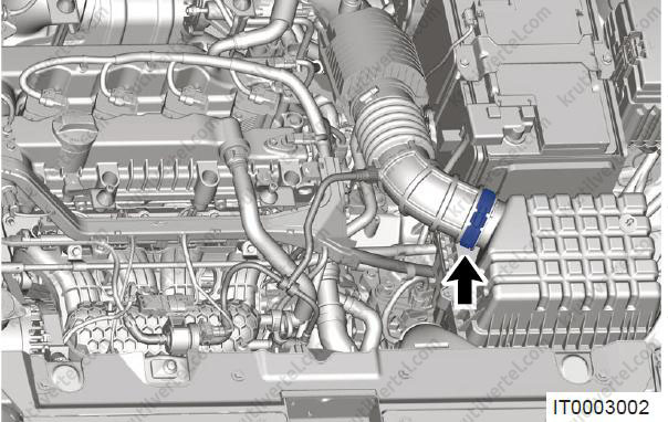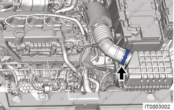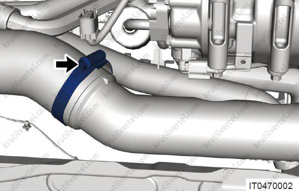 - Послабте черв'яковий хомут (стрілка) і від'єднайте повітрозабірний шланг у зборі від турбонагнітачів.