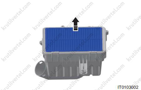 - Зніміть верхній корпус та змінний елемент повітряного фільтра у напрямку стрілки.