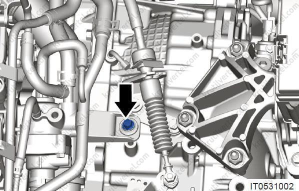 - Відкрутіть кріпильний болт (стрілка) з кронштейна джгута проводів.