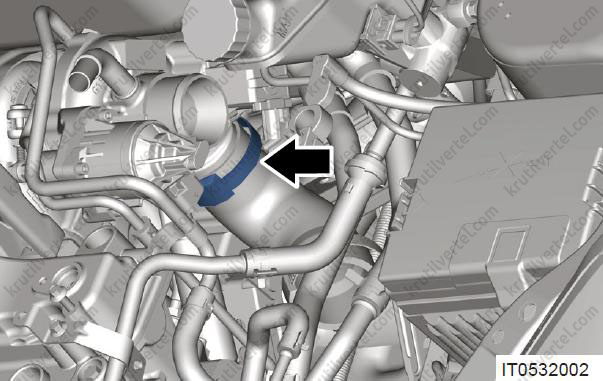 - Від'єднайте з'єднувальний затискач між розширювальним бачком та двигуном та витягніть патрубок (стрілка).