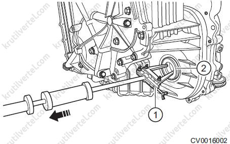 4. За допомогою спеціального інструменту (1) зніміть сальник (2) лівого приводного валу з коробки передач у зборі.