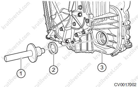 - Використовуючи спеціальний інструмент (1) та молоток, встановіть сальник (2) лівого приводного валу в коробку передач у зборі (3).