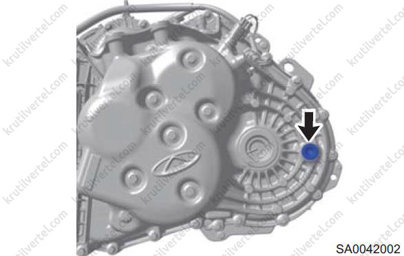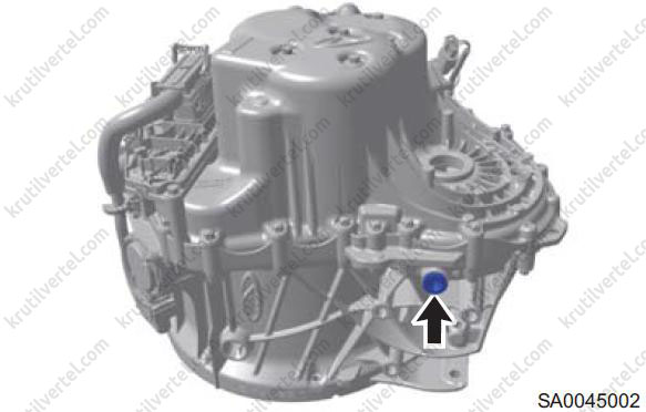 4. Відкрутіть пробку (стрілка) зливного отвору та злийте трансмісійне масло.