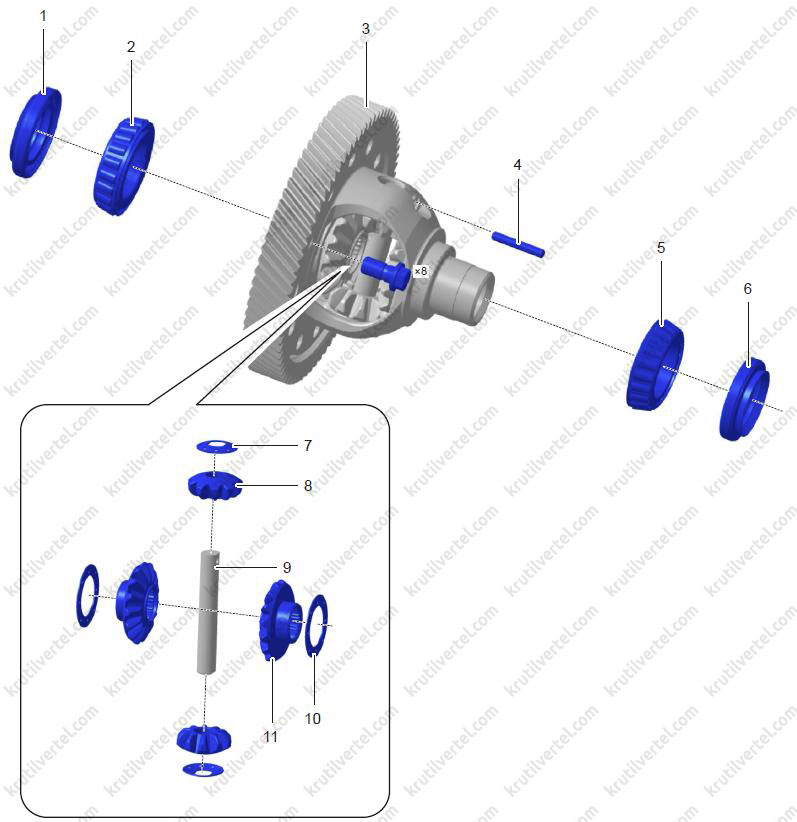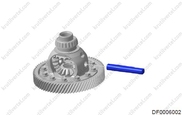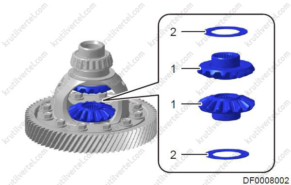 У коробці диференціала знаходяться дві бічні шестірні, вісь сателітів і два сателіти. Ведена шестерня головної передачі з'єднана із коробкою диференціала болтами. Вісь сателітів, яка закріплена на коробці диференціала, змушує сателіти обертатися при роботі диференціала, обертаючи бічні шестерні. Бічні шестерні з'єднані з приводними валами коліс для передачі моменту, що крутить, до колес.