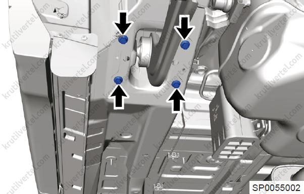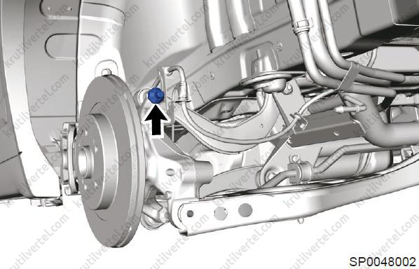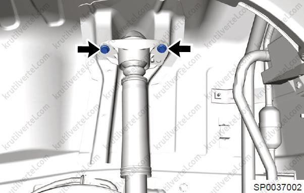 - Відкрутіть два стяжні болти (стрілки) між верхньою частиною заднього лівого амортизатора в зборі та кузовом.