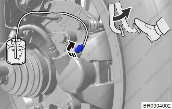 4. Швидко затягуйте штуцер прокачування щоразу при відпусканні педалі гальма, потім звільніть педаль гальма.