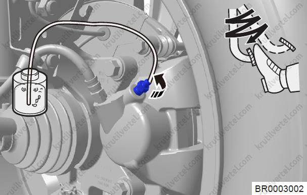 - При стравлюванні повітря будьте обережні, оскільки гальмівна рідина під високим тиском може бризнути зі штуцера прокачування.