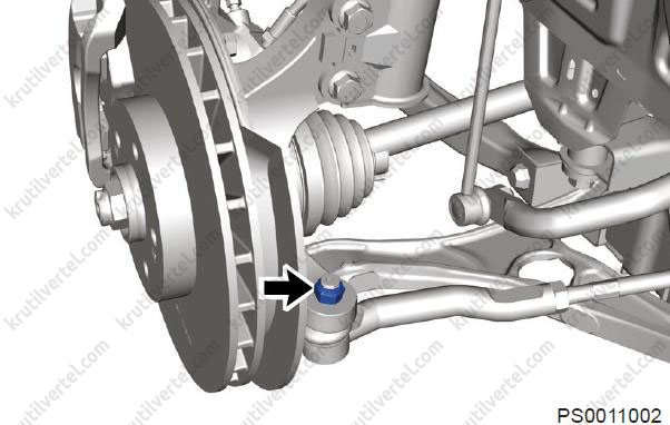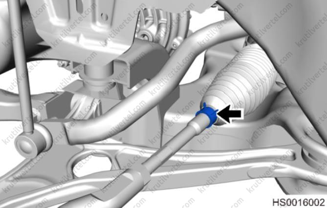 - Відверніть контргайку (стрілка) між наконечником лівої рульової тяги та переднім лівим поворотним кулаком у зборі.