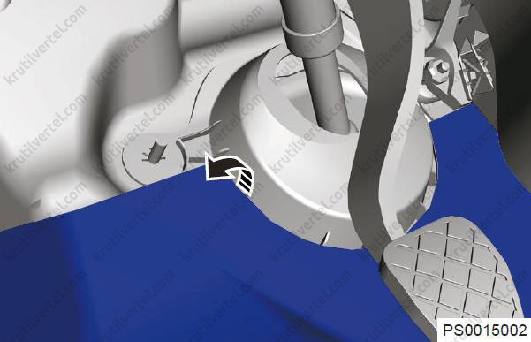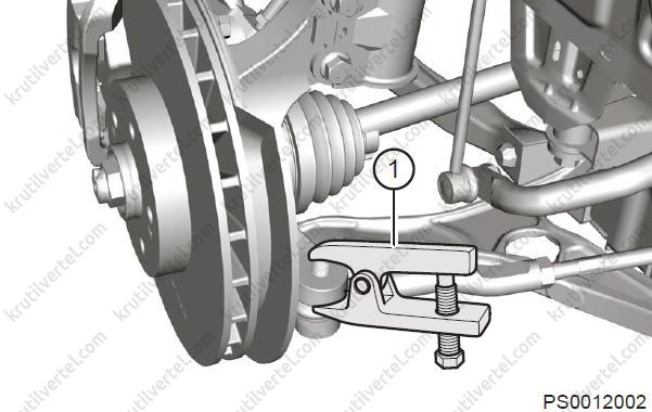 - Встановіть знімач кульових пальців (1) і від'єднайте наконечник кермової тяги від поворотного кулака в зборі.