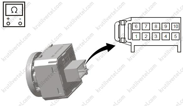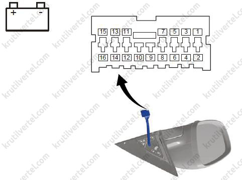- Подайте напругу акумулятора на контакти роз'єму і перевірте роботу зовнішнього дзеркала заднього виду відповідно до наступної таблиці.