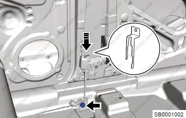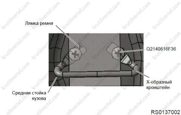 4. Візьміть справний вилковий кронштейн і пропустіть через нього лямку ременя. Отвір під вилковий кронштейн необхідно поєднати з отвором у середній стійці кузова (зверніть увагу на напрямок установки вилкового кронштейна, стрілка, нанесена на вилковий кронштейн, повинна бути звернена до даху), затягніть гвинт з напівкруглою головкою та хрестоподібним шліцом66 (Q21). Момент затяжки: 2,5±0,5 Н∙м.