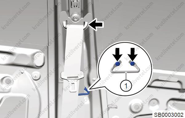 5. Після виконання вищевказаних процедур пропустіть нижню кріпильну торцеву пластину, скобу та лямку ременя безпеки через отвір у верхній панелі облицювання середньої стійки кузова. Після встановлення панелі облицювання середньої стійки кузова встановіть болт кріплення нижньої торцевої пластини ременя безпеки у відповідний отвір на порозі дверей і, нарешті, затягніть болт (лямка ременя на ділянці між нижньою торцевою пластиною та направляючим кільцем) повинна бути гладкою, без пошкоджень. Момент затягування: 50 ± 5 Н∙м.