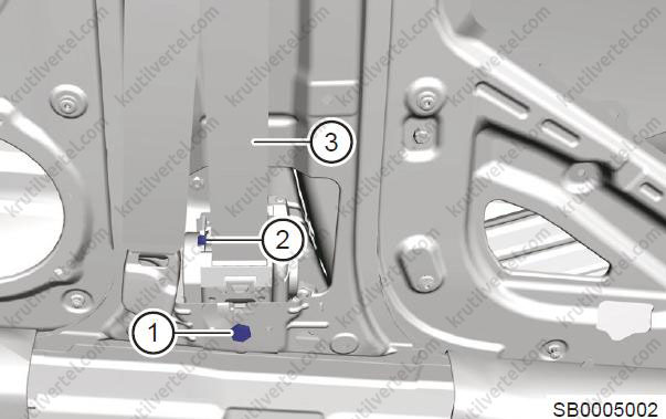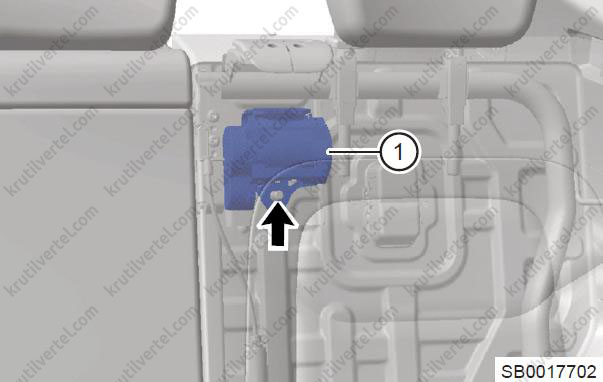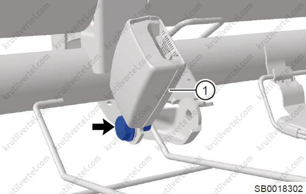- Відкрутіть болт (1) кріплення ременя безпеки переднього сидіння, що втягує котушки.