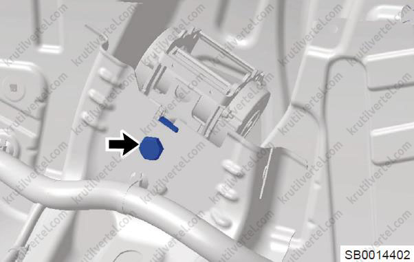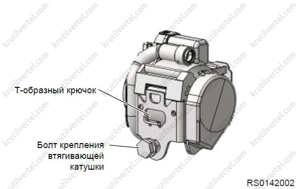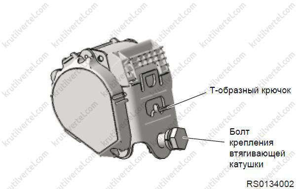 - Відкрутіть болт (стрілка) кріплення котушки, що втягує, і вийміть Т-подібний гачок з панелі кріплення.