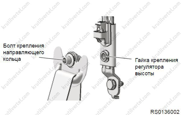 3. Після встановлення котушки, що втягує, встановіть болт кріплення направляючого кільця в гайку кріплення регулятора висоти і, нарешті, затягніть болт (лямка ременя на ділянці між котушкою, що втягує, і направляючим кільцем повинна бути гладкою, без пошкоджень і перекручування). Момент затягування: 50 ± 5 Н∙м.