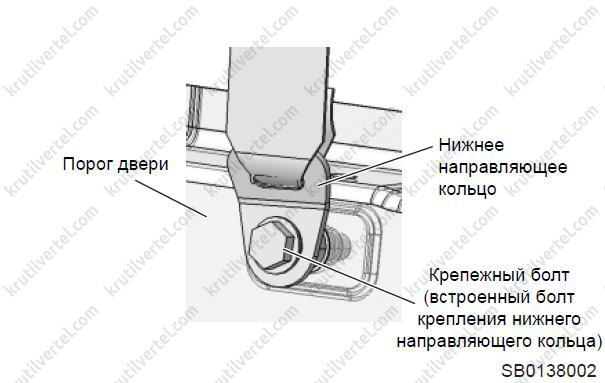 - Після встановлення котушки, що втягує, встановіть болт кріплення напрямного кільця в кріпильний отвір на задній стійці кузова, після чого затягніть болт, щоб встановити напрямне кільце. Момент затягування: 50 ± 5 Н∙м.