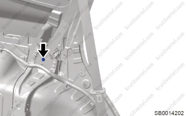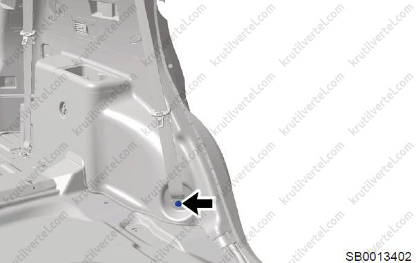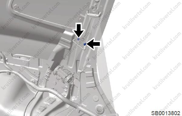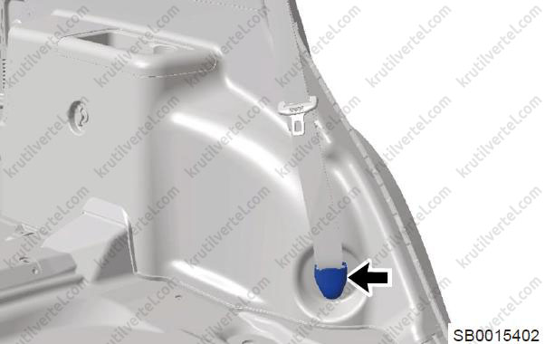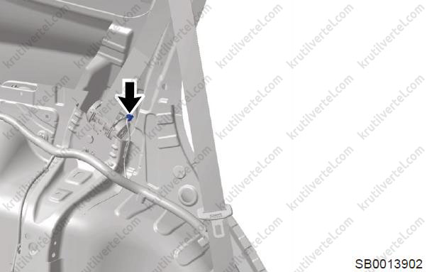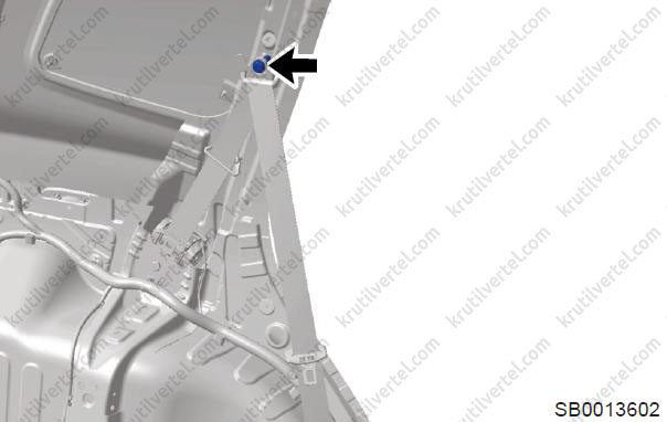 - Після виконання вищевказаних процедур пропустіть нижню кріпильну торцеву пластину, скобу та лямку ременя безпеки через отвір у верхній панелі облицювання задньої стійки кузова. Після встановлення верхньої панелі облицювання задньої стійки кузова встановіть болт нижньої торцевої пластини ременя безпеки у відповідний отвір у колісній арці і нарешті затягніть болт (стрілка). Момент затягування: 50 ± 5 Н∙м.