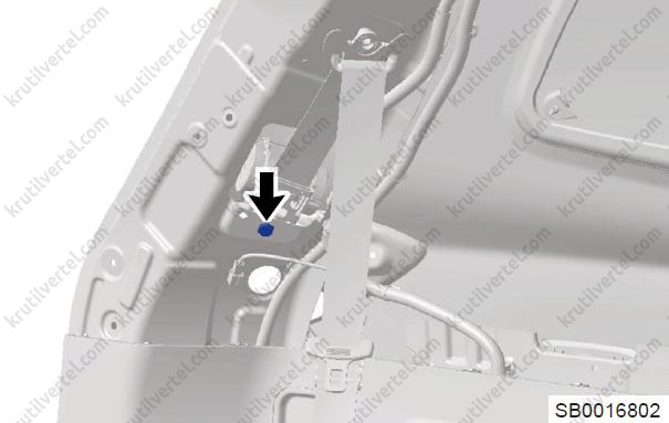 - Викрутіть верхній болт кріплення ременя безпеки переднього сидіння (стрілка).