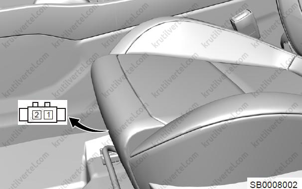 - Зніміть роз'єм втягуючої котушки ременя безпеки переднього сидіння (2) (ремінь безпеки для версії топового рівня комплектації).