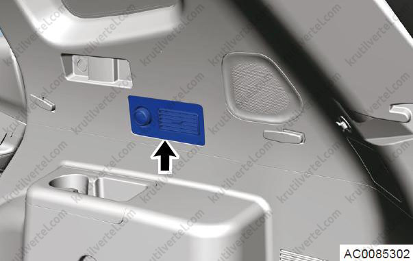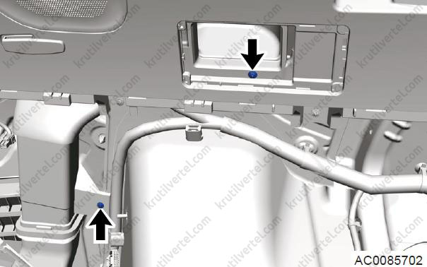- Відкрутіть два кріпильні гвинти (стрілки) на центральному випускному повітроводі кондиціонера третього ряду сидінь.