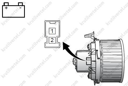 2. Підключіть «позитивний» (+) провід акумуляторної батареї до контакту №1, а «негативний» (-) провід акумуляторної батареї до контакту №2. Переконайтеся в плавності роботи приводу вентилятора.