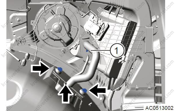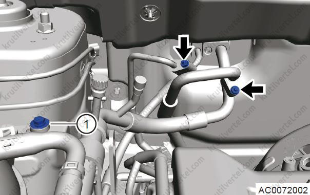 - Відкрутіть три болти (стрілка) на хомуті труби високого/низького тиску. Відкрутіть болт кріплення (1) між лінією подачі та заднім розширювальним клапаном.