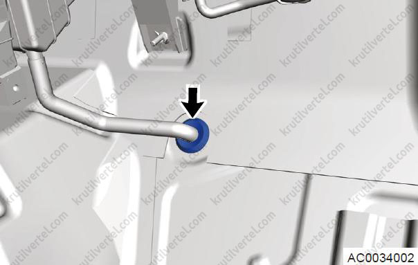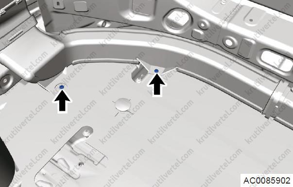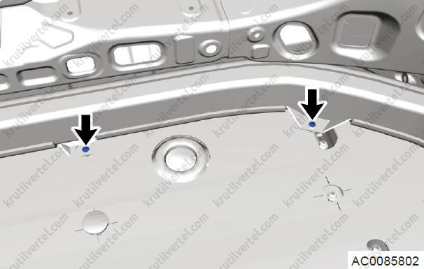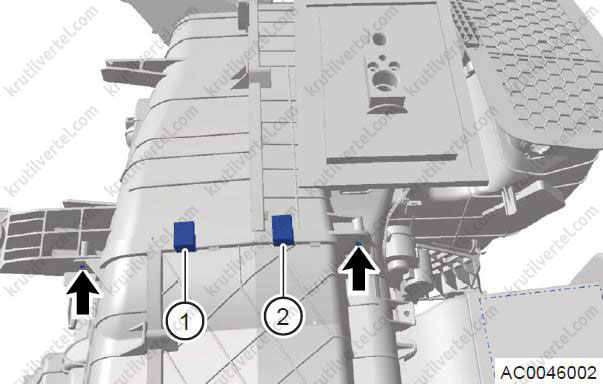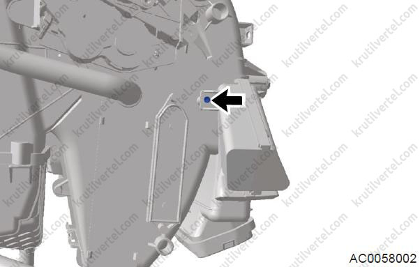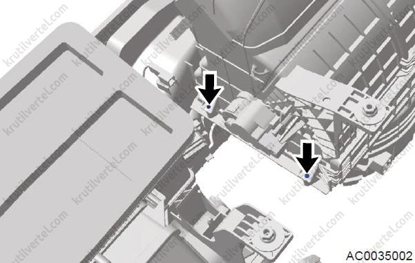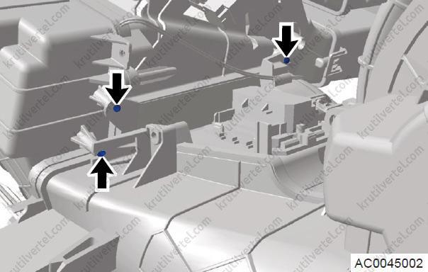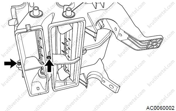 - Відкрутіть два кріпильні гвинти (стрілки) на лівому випускному повітроводі кондиціонера третього ряду сидінь.