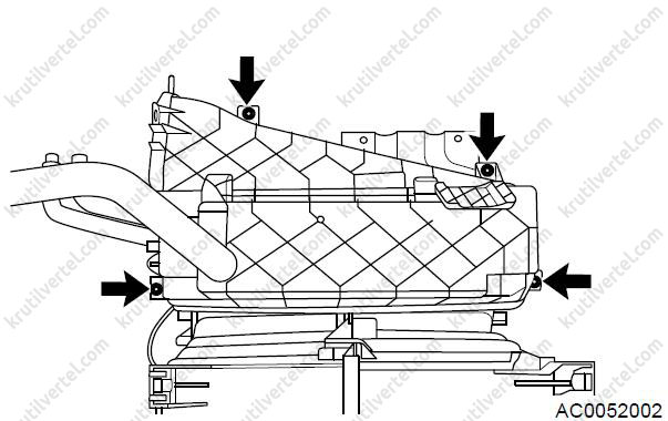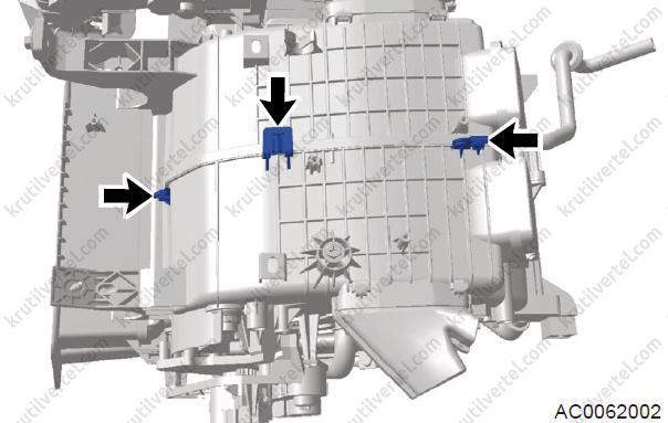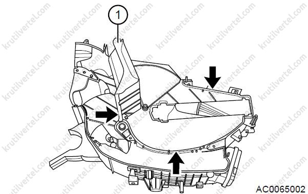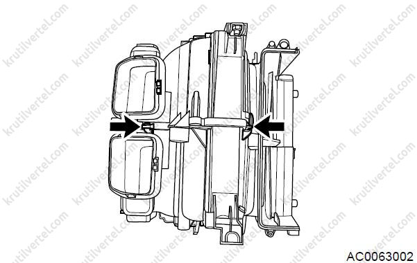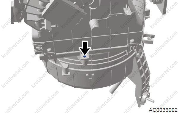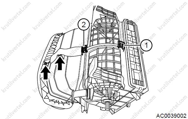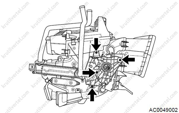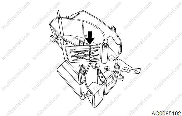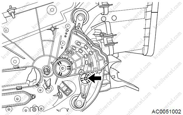 5. Установка проводиться в порядку, зворотному порядку зняття, при цьому враховуйте наступне: при установці нанесіть невелику кількість мастила на контактну поверхню важеля приводу заслінки внутрішньої/зовнішньої циркуляції та самої заслінки внутрішньої/зовнішньої циркуляції, що забезпечить плавну роботу приводу.
