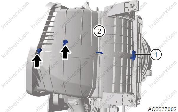 - Від'єднайте роз'єм (1) вентилятора в зборі, відкрутіть два гвинти з вентилятора і відстебніть фіксатор (стрілка).