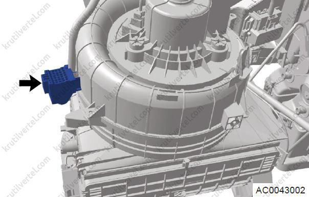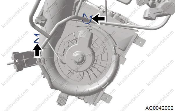 - Від'єднайте роз'єм приводу заслінки внутрішньої/зовнішньої циркуляції (стрілка).