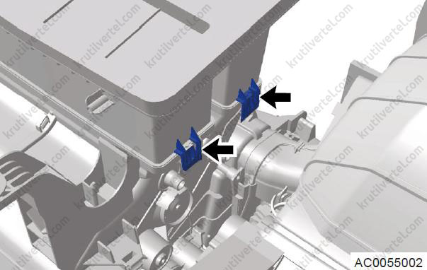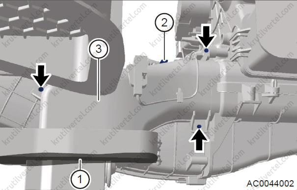 - Відкрутіть два кріпильні гвинти (стрілки) на правому випускному повітроводі кондиціонера третього ряду сидінь.