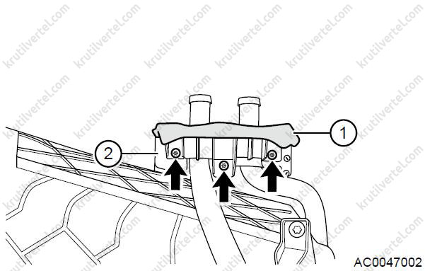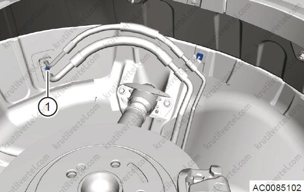 - Відкрутіть кріпильний болт (1) між заднім випарником та лінією компресора у зборі I, а також між конденсатором та задньою лінією випарника у зборі I та заднім розширювальним клапаном.